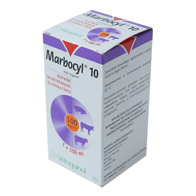 Крупный рогатый скот2 мг марбофлоксацина/кг массы тела (т.е. 1 мл/50 кг при 10% растворе)1 раз в сутки (в/м или п/к)3–5 дней (по усмотрению ветеринара)